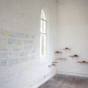 Walcot Chapel, Bath. A group exhibition featuring work by artists Jo Ball, Jessie Blindell, and Rebecca Burton. All the artists are interested in human relationships to place - to the earth beneath our feet. Their works could be situated within a subtle category of ‘landscape’, an approach of making art that began with prehistoric cave drawings and runs through to the present day. Working with earth pigments, capturing sensory experiences of the outdoors and creatures who live there, or examining the discord between our species and others.