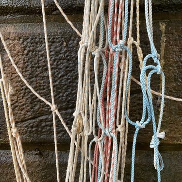 Four large nets of organic cotton cordage dyed with indigo, madder, weld, and coreopsis. The measurements of the gauge of the nets correspond to each member of my immediate family and myself: mother, father, son, and daughter.