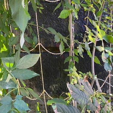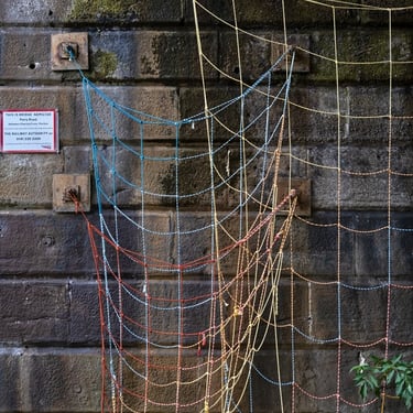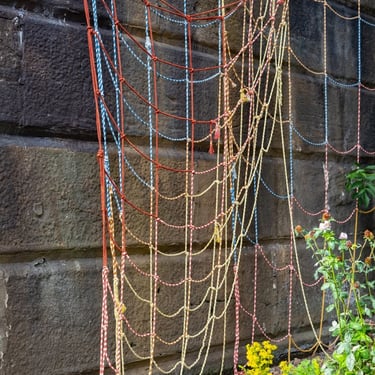 Points of Attachment, 2022. Cotton cord dyed with weld, coreopsis, madder, and indigo. Dimensions variable, shown here approximately 7 x 5 m. Some images show the piece after it has been up for three months, the dye fading in the sunlight, the site in autumn once the plants have lost their leaves.