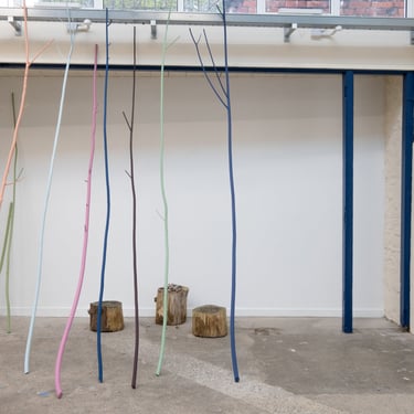 Shelter, 2024. Painted willow, tree stumps, snail shells. Dimensions variable.