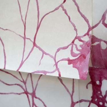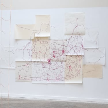 Pathways, 2024. Blackberry ink on Japanese paper. 4 x 2.5 m. The drawing maps out the paths in Braunton Burrows, a sand-dune system near the gallery, which will be directly affected by sea level rise.