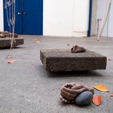 Holding, falling, 2024. Breeze blocks cast in soil and paper, wooden trolleys, string nets, casts of the artist's hands in unfired terracotta, paper leaves.